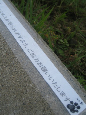 立て看板が二つと、手すりに一枚