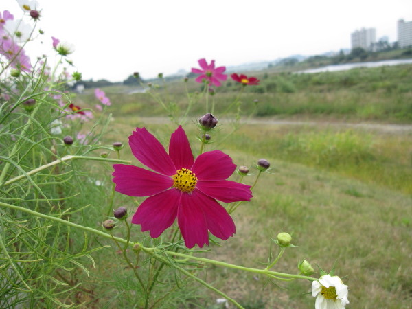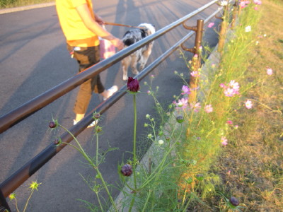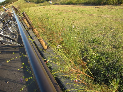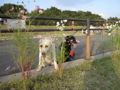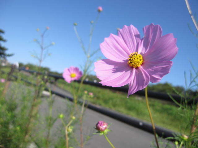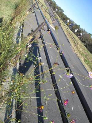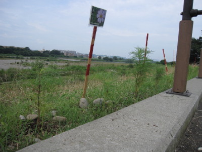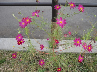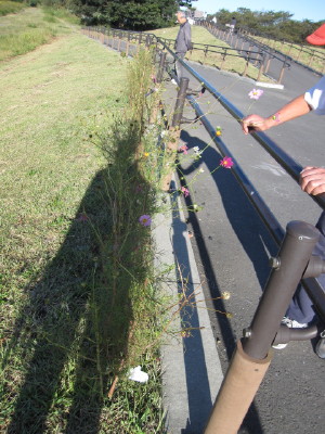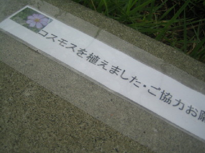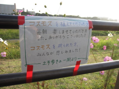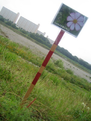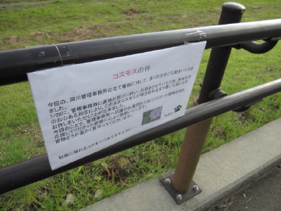 中ほどの小さいのが後から移植したものです| コスモスの件 今回の、河川管理事務所の立て看板に対して、多くの方のご心配をいただき ました。 7/28に、管理事務所に直接お詫びに伺い、お話をさせていただき、担当の方 のお心ある対応により、このままコスモスが咲き終わるまで置いて良いとの お許しをいただくことが出来ました。 今回のことで、管理事務所へ抗議のお電話を入れてくださった皆様を初め、 応援してくださった皆様に心より感謝いたします。 皆様どうか温かく見守ってくださいませ。 秋風に揺れるコスモスに会えますように・・・ |
